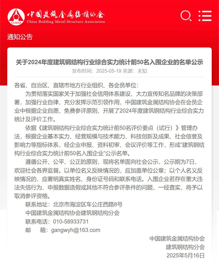為貫徹落實(shí)國(guó)家關(guān)于加強(qiáng)社會(huì)信用體系建設(shè)、大力宣傳知名品牌的決策部署,加強(qiáng)行業(yè)自律,充分發(fā)揮示范引領(lǐng)作用,中國(guó)建筑金屬結(jié)構(gòu)協(xié)會(huì)在會(huì)員企業(yè)中根據(jù)企業(yè)自愿、免費(fèi)參評(píng)原則,開(kāi)展了2024年度建筑鋼結(jié)構(gòu)行業(yè)綜合實(shí)力統(tǒng)計(jì)及評(píng)價(jià)工作。依據(jù)《建筑鋼結(jié)構(gòu)行業(yè)綜合實(shí)力統(tǒng)計(jì)前50名評(píng)價(jià)要點(diǎn)(試行)》管理辦法,遵循公開(kāi)、公平、公正的原則,根據(jù)企業(yè)基本實(shí)力、經(jīng)營(yíng)規(guī)模與技術(shù)能力、科技創(chuàng)新及成果、社會(huì)信譽(yù)及影響力等指標(biāo)體系,經(jīng)企業(yè)申報(bào)、資料初審、會(huì)議評(píng)價(jià)等工作,形成“建筑鋼結(jié)構(gòu)行業(yè)綜合實(shí)力統(tǒng)計(jì)前50名入圍企業(yè)”公示名單。